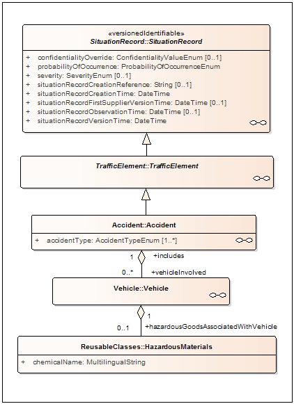 Het type Accident wordt gebruikt voor het beschrijven van situaties bij ongevallen. Naast de basis elementen van een situationRecord bevat deze specialisatie het verplichte element accidentType en het optionele element vehicleInvolved: