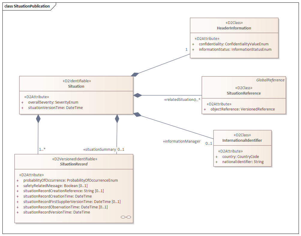 | situationSummary | SituationRecord | Ja | NVT | Een SituationRecord dat een samenvatting geeft van de informatie beschreven door de bijbehorende Situation, d.w.z. een superset van minimaal de locatie- en geldigheidsinformatie van alle (overige) SituationRecords in deze Situation. |