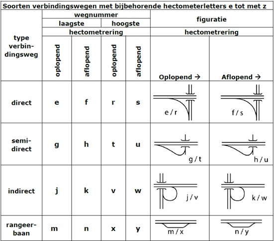 Voor wegbeheerder Rijk gelden de volgende tabellen (afkomstig uit de Richtlijn Hectometrering). Deze kunnen ook voor wegbeheerder Provincie gebruikt worden: